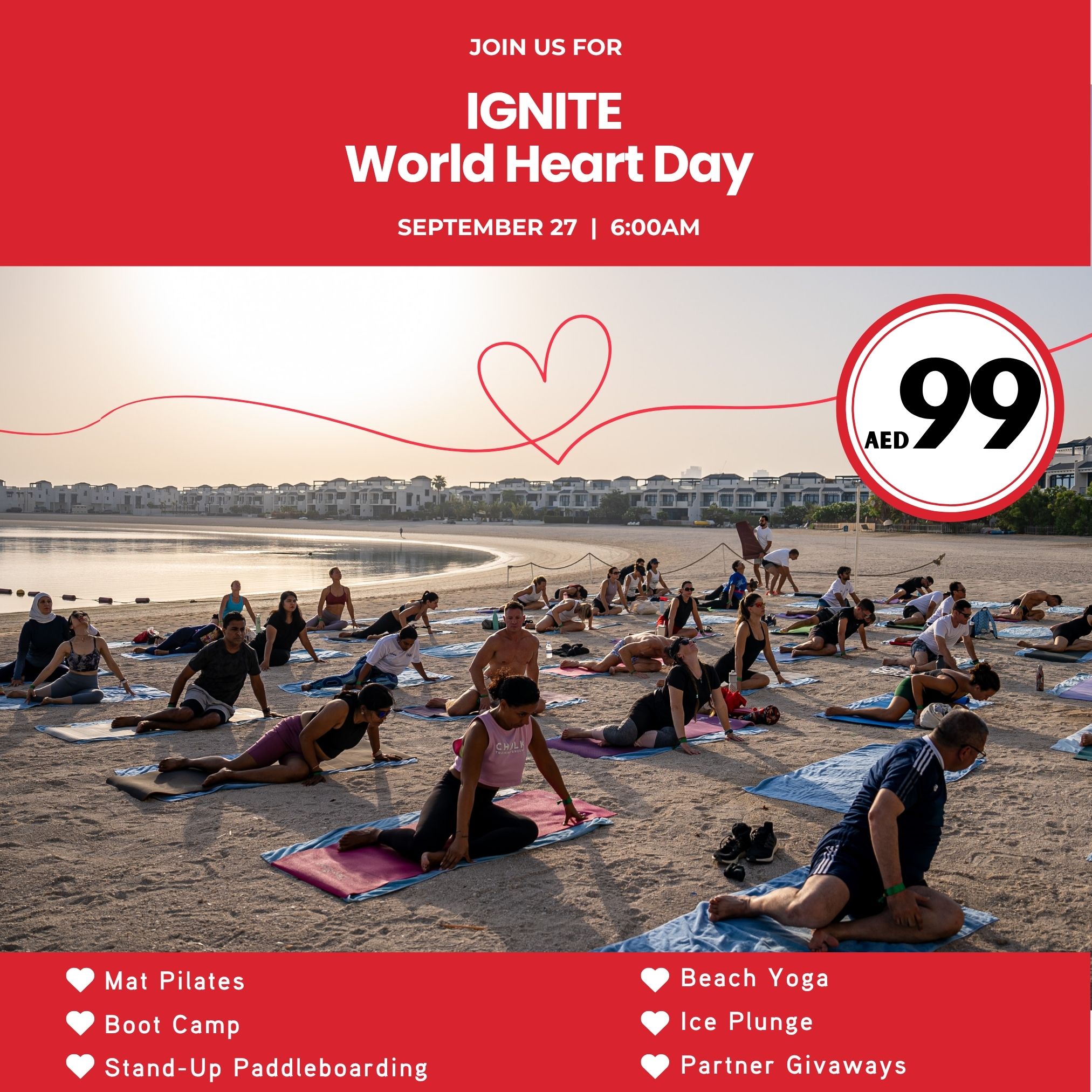 After the success of our World Mental Health Day event on May 31st, we’re back! On September 27th, IGNITE is hosting another AED 99 Community Morning in celebration of World Heart Day bringing together movement, recovery, and wellness in one unforgettable morning by the beach. Expect Pilates, Beach Yoga, Ice Plunges, Boot Camp, SUP and Kayak Rentals, plus activations from leading wellness brands and partners who share our mission: to move people physically, mentally, emotionally. IGNITE World Heart Day